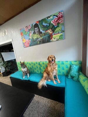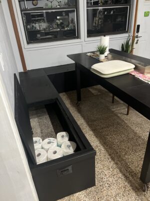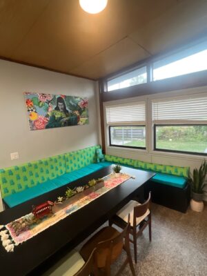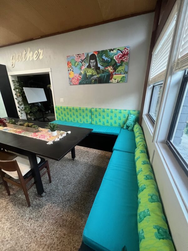 We created a custom-built-in seating banquet with cushions. We also designed custom fabric and belows to match our Mid-century house and art.